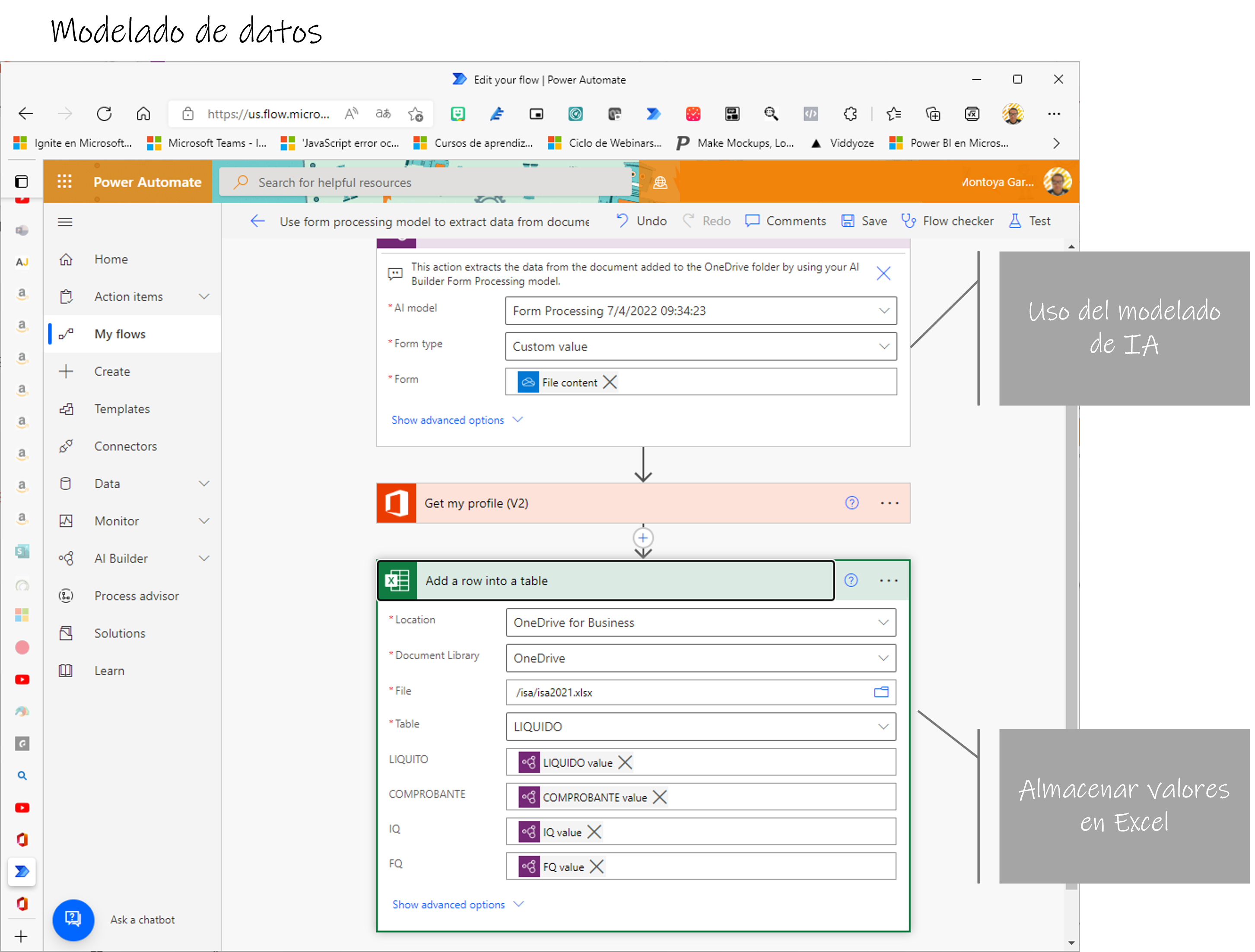 Ahora diseñe un desencadenador que use el modelo IA para bajar los datos a una hoja de Excel.